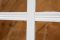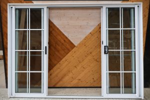 This alloy colonial sliding door unit is white in colour and containing clear toughened glass.