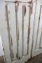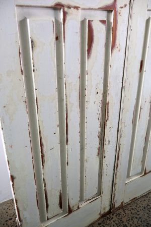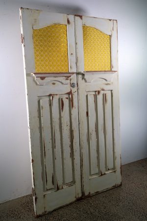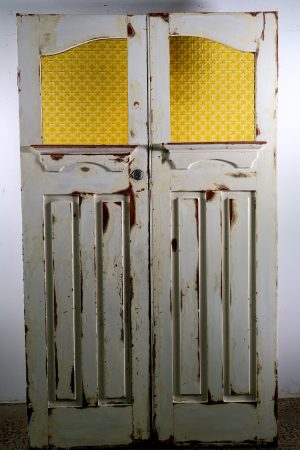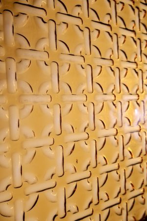 Retro amber glass inserts with arched design.