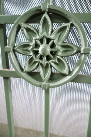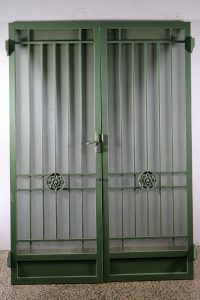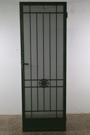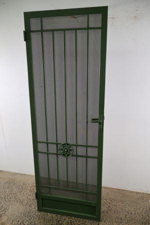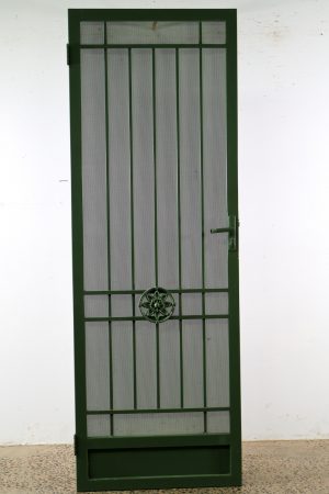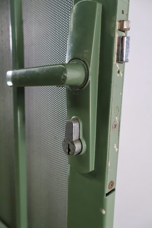 This Camberwell security door is a heavy steel piece that’s green in colour.