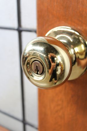 Lockwood lock and brass handle set, striker plate and hinges included.