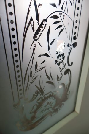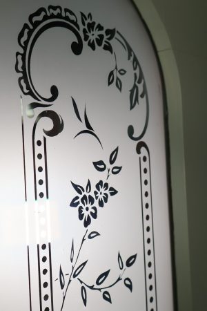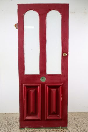 Cricket Bat front door that is ready to go. Pine timber frame with arched glass panel containing patterns ( see photos )