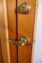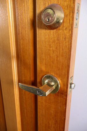 Comes with brass handle set, lock, striker plate and hinges.