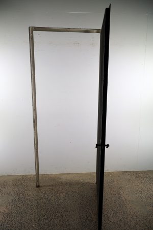 A heavy duty construction, hinged in a frame with lever set, lock and key.