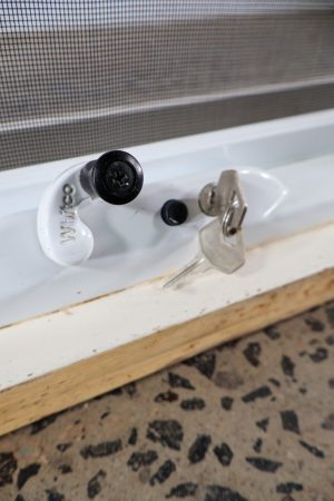 Hardwood timber frame, fly screen winder with lock and key.
