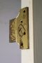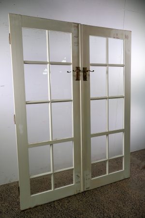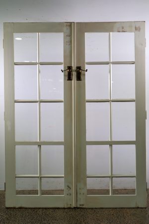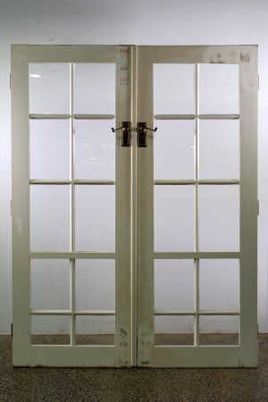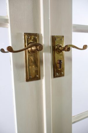 Large brass hinges, handle sets, mortice locks, keys, and striker plates included ( some surface rust )