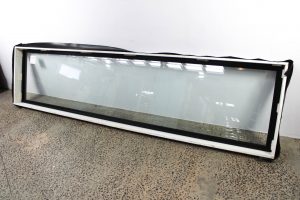 This new and low double glazed window is black in colour, a fixed non opening window with reveals. ( 125 mm in depth)
