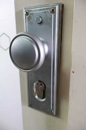 Chrome handle set, lock and key included.