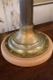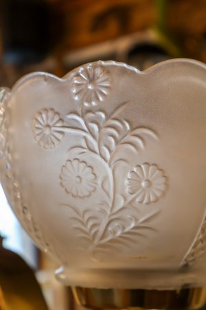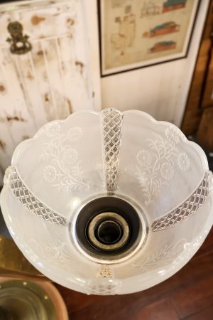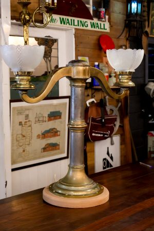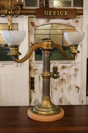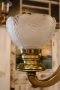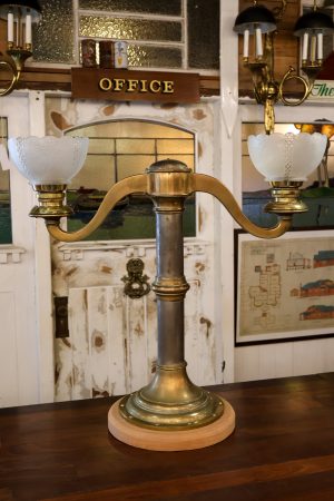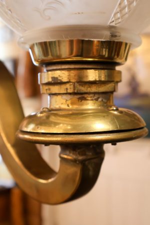 Heavy brass construction with two curved arms that contain ultra thick frosted glass shades.