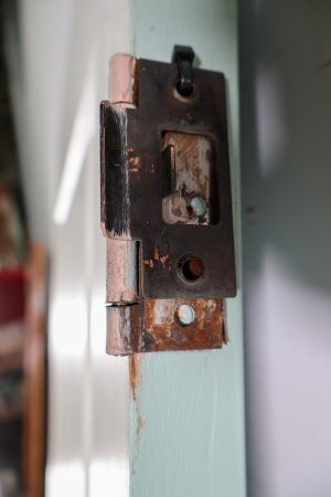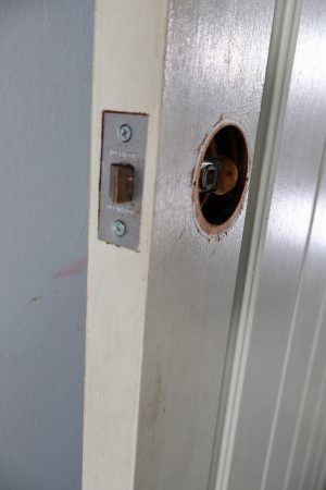 MDF and hardwood timber with hinges, tubular latch and striker plate.