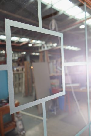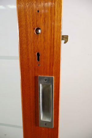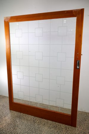 This huge glass sliding door is not your average door. This monster is made from hardwood timber that’s unpainted and oiled. Clear glass with an etched design throughout. Lane lock and pull handle.