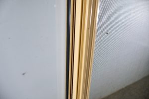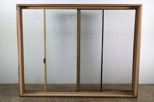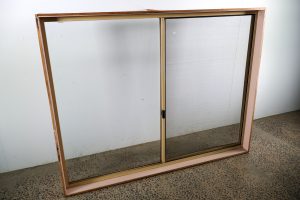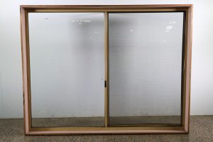 Hardwood timber reveals, clear glass, cream in colour.