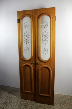 Patterned glass inserts, hardwood frames with ply surface, brass knobes and hinges included.