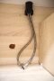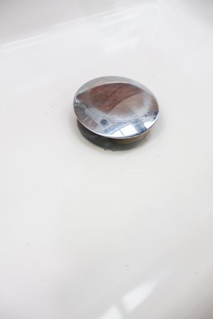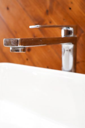 White porcelain sink with chrome flick mixer.