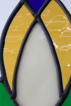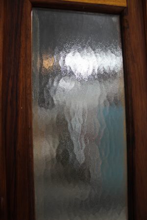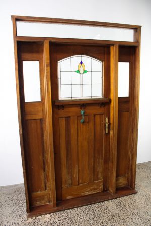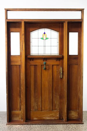 Toughened cathedral glass in sidelights, spotswood and coloured flemish glass make up the door.