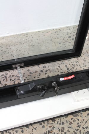 This new double glazed window is black in colour, an awning design with reveals. ( 125 mm in depth)