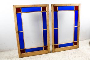 Baltic pine timber frames that have been sanded back, red and blue feature glass with clear centres.