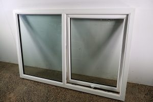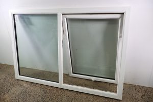Recycled double glazed window made from PVC and white in colour.