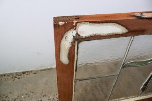 Redwood timber frame with various styles of glass including English muffle with loads of blues, greens and ambers.