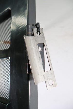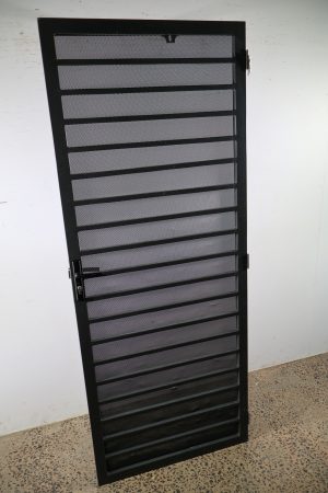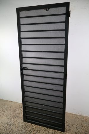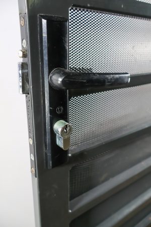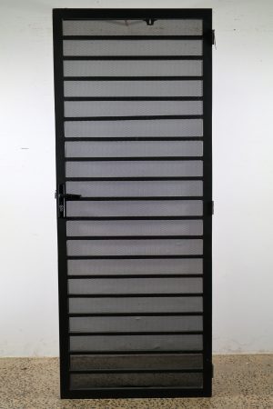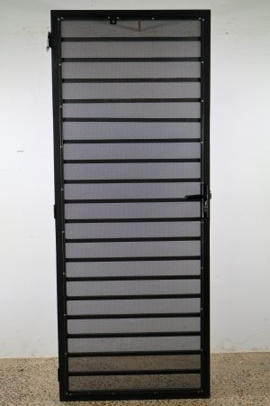 This sturdy security door is a heavy duty piece with a steel frame that’s a dark grey in colour.