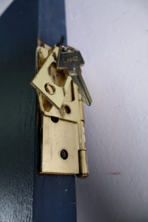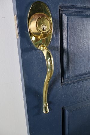 Brass Lane lock, striker plate, key, hinges and pull handle all included.