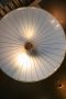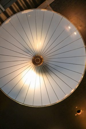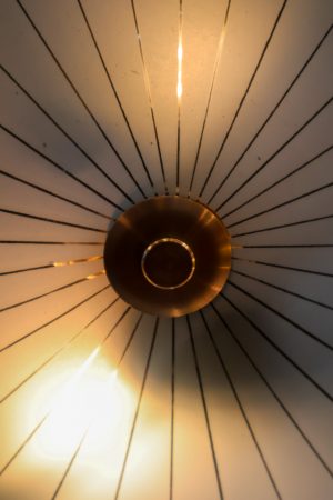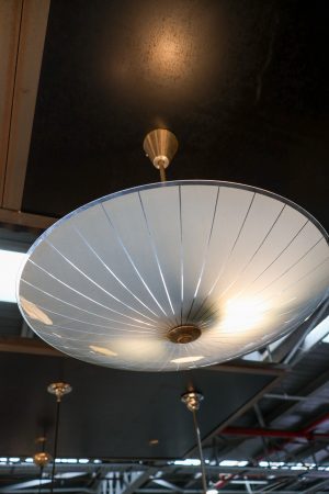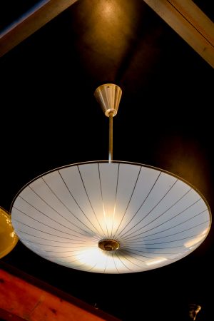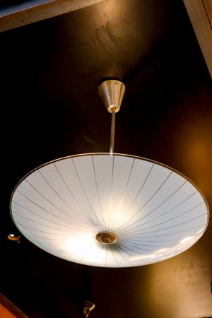 Salvaged from a Caulfield home, this blue textured glass shade contains a clear pin stripe lines throughout.