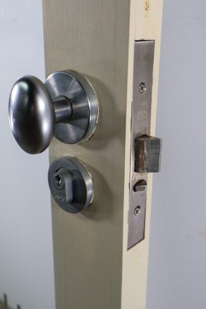 Chunky timber frame with chrome handle set and Novas locking system.
